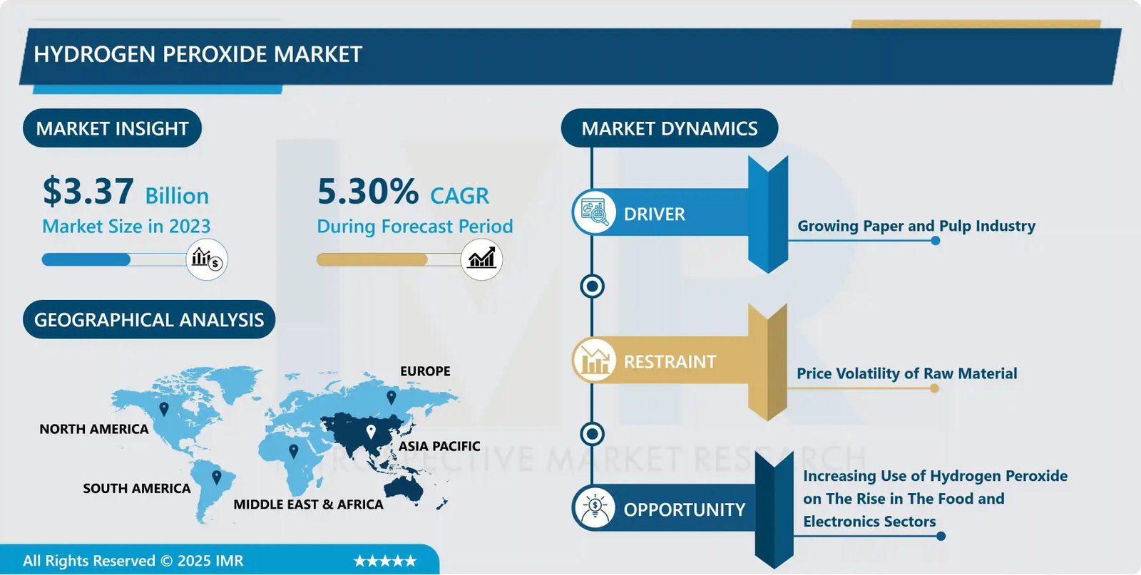 According to a new report published by Introspective Market Research, Hydrogen Peroxide Market by Product Concentration, Application, and End-Use Industry, The Global Hydrogen Peroxide Market Size Was Valued at USD 3.37 Billion in 2023 and is Projected to Reach USD 5.36 Billion by 2032, Growing at a CAGR of 5.30% From 2024–2032.”