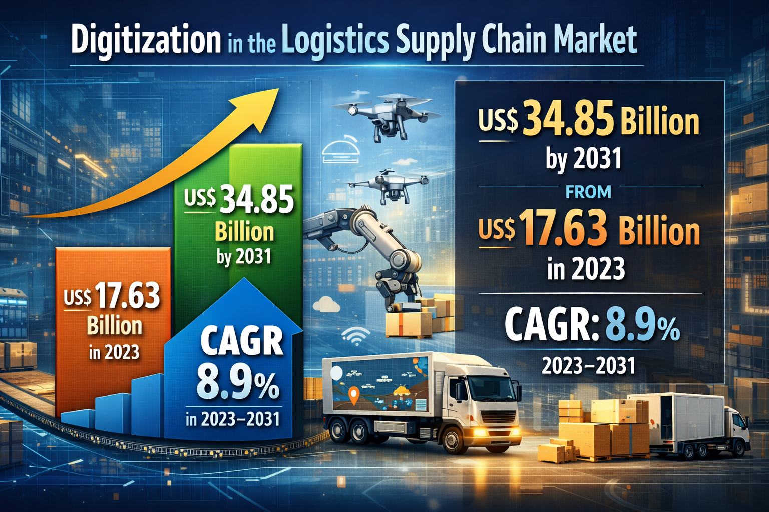 According To The Insight Partners, The Digitization in the logistics supply chain reaching US$ 34.85 billion by 2031, up from US$ 17.63 billion in 2023, with a compound annual growth rate (CAGR) of 8.9% during the forecast 2023–2031 .This growth is mainly driven by the rising need for efficient supply chain management solutions and the rapid expansion of the retail and e-commerce industries, which are encouraging companies to adopt advanced digital technologies in logistics operations.