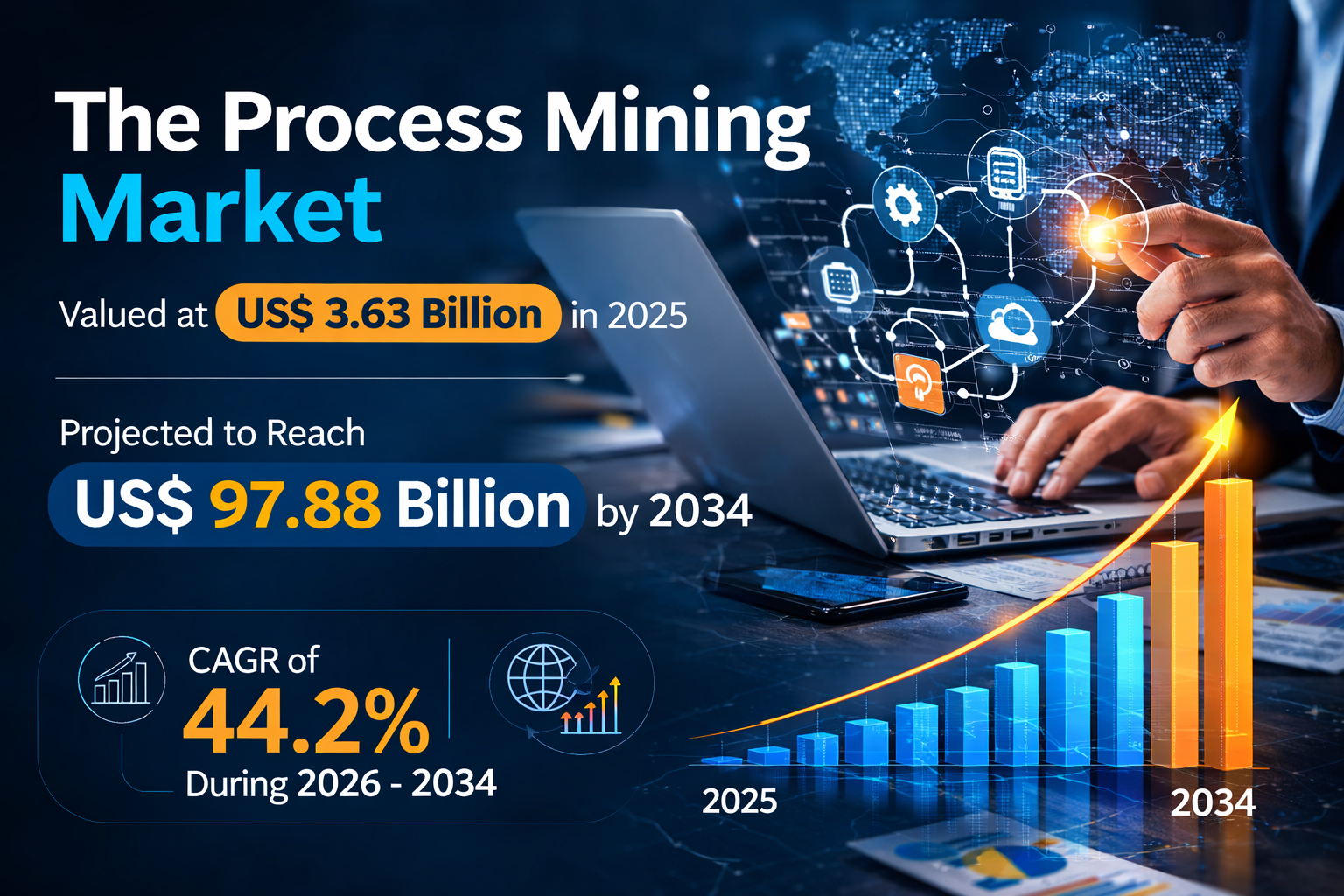 The Process Mining Market is witnessing significant transformation as organizations worldwide accelerate their digital transformation initiatives. Process mining technology enables businesses to analyze and visualize operational workflows using data extracted from enterprise systems, allowing them to detect inefficiencies and improve performance. One of the key trends shaping the market is the growing demand for data-driven decision-making and real-time operational visibility. Companies across industries such as banking, manufacturing, healthcare, and telecommunications are implementing process mining solutions to understand how their processes actually function rather than relying on theoretical models. The Process Mining Market, valued at US$ 3.63 billion in 2025, is projected to reach US$ 97.88 billion by 2034, expanding at a CAGR of 44.2% during 2026-2034.