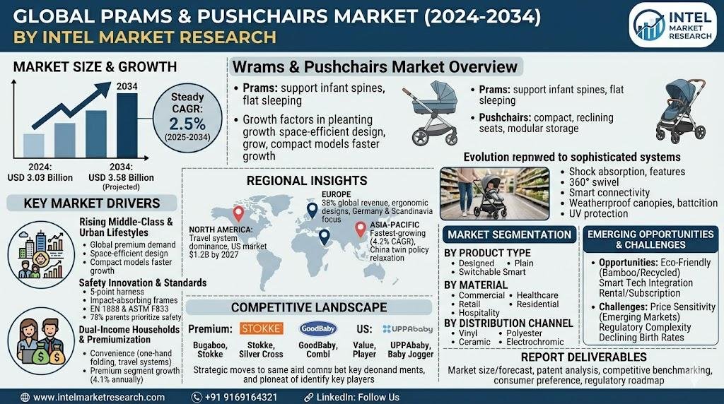 According to a new report from Intel Market Research, the global prams and pushchairs market was valued at USD 3.03 billion in 2024 and is projected to reach USD 3.58 billion by 2034, growing at a steady CAGR of 2.5% during the forecast period (2025-2034). This growth is fueled by rising disposable incomes, rapid urbanization, and evolving parental preferences toward premium and technologically advanced baby mobility solutions.