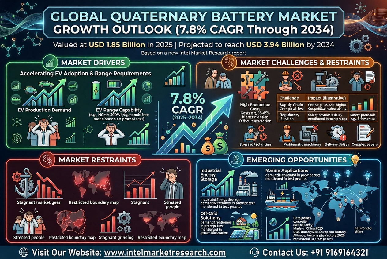 According to a new report from Intel Market Research, the global Quaternary Battery market was valued at USD 1.85 billion in 2025 and is projected to reach USD 3.94 billion by 2034, growing at a CAGR of 7.8% during the forecast period (2026-2034). This growth is fueled by accelerating EV adoption worldwide and increasing demand for high-energy-density storage solutions in renewable energy systems.